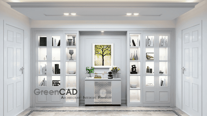 Khu sảnh hoặc phòng trưng bày mini gây ấn tượng bởi tủ kệ âm tường tông trắng tinh khôi, khéo léo lồng đèn led để tôn vinh những món đồ trang trí. Những ô panel mảnh mai làm bật lên nét cổ điển, tạo hiệu ứng chiều sâu cho thị giác - gợi nhắc về sự xa hoa - tinh tế của kiến trúc xưa, vừagiúp bề mặt không còn đơn điệu vàbố cục gọn gàng lại toát lên vẻ hiện đại. Mảng tường trung tâm trang trí bằng tranh hoặc chi tiết điêu khắc trở thành điểm nhấn cá tính, khẳng định gu thẩm mỹ của gia chủ.