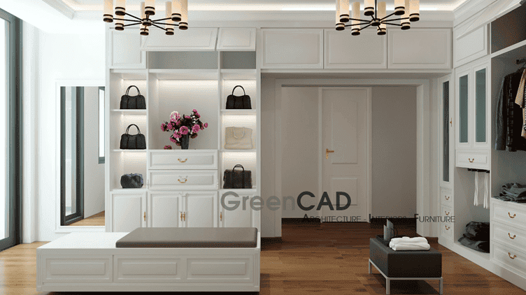 Phòng thay đồ lại khiến người ta trầm trồ bởi sự tinh tế trong cách bố trí. Hệ tủ trắng cùng tay nắm kim loại sang trọng, sắp xếp khoa học để tận dụng tối đa diện tích. Băng ghế ở trung tâm giúp gia chủ thoải mái thử đồ, đồng thời tạo nên nét chấm phá thanh lịch. Mỗi ngăn tủ, hộc kéo đều được tính toán tỉ mỉ, biến việc lựa chọn trang phục trở thành niềm vui hằng ngày.