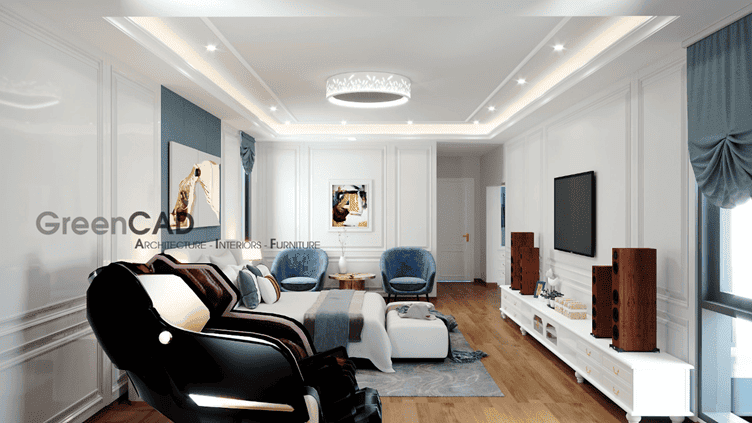 Phòng khách, Greencad sử dụng những đường phào chỉ thanh mảnh trên tường, đồng thời chọn màu xanh xám nhẹ nhàng cho nội thất. Từng món đồ được sắp đặt khéo léo, từ ghế bành mang kiểu dáng độc đáo đến tấm thảm êm ái dưới sàn, tạo nên sự hài hòa mà còn không lấn át ánh sáng và không gian thoáng đãng, tạo cảm giác thư giãn tuyệt đối cho tất cả những người ghé thăm, đủ trang trọng để tiếp khách, nhưng vẫn ấm cúng, phù hợp cho những buổi sum họp gia đình...