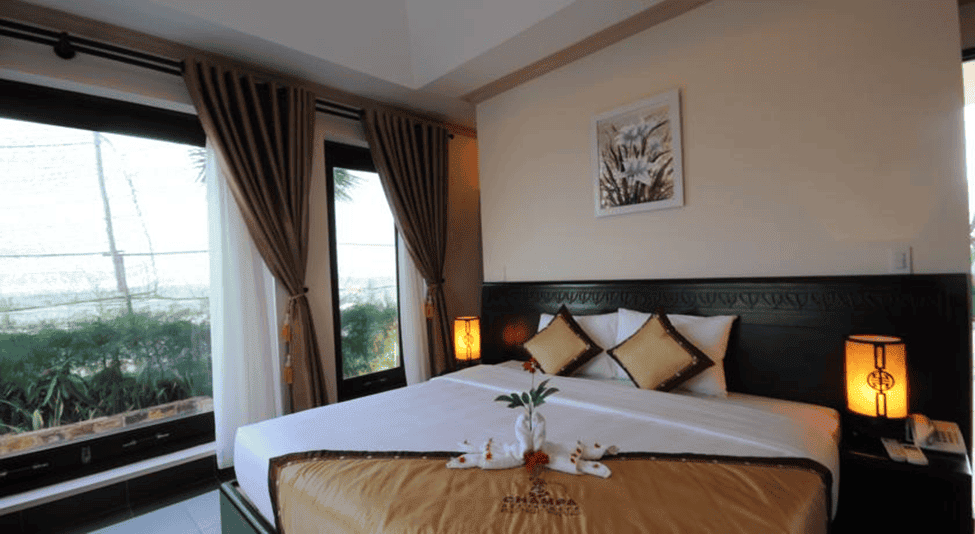 Champa Resort tái hiện trọn vẹn tinh thần kiến trúc Champa qua từng đường nét, vật liệu và họa tiết trang trí, cảnh quan toàn khu nghỉ dưỡng cũng được thiết kế đồng điệu tạo nên không gian hoài cổ nhưng vẫn rất sang trọng.