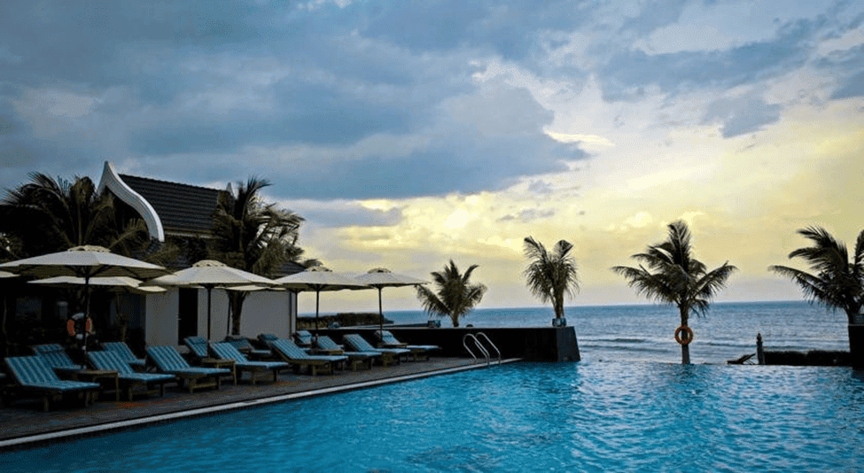 Khu vực hồ bơi tràn viền hay hồ bơi vô cực được thiết kế ngay trung tâm, tạo hiệu ứng không gian mở, giúp khách nghỉ dưỡng vừa thư giãn vừa ngắm nhìn cảnh biển thơ mộng.